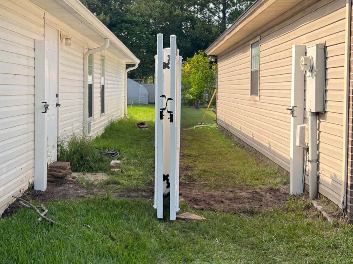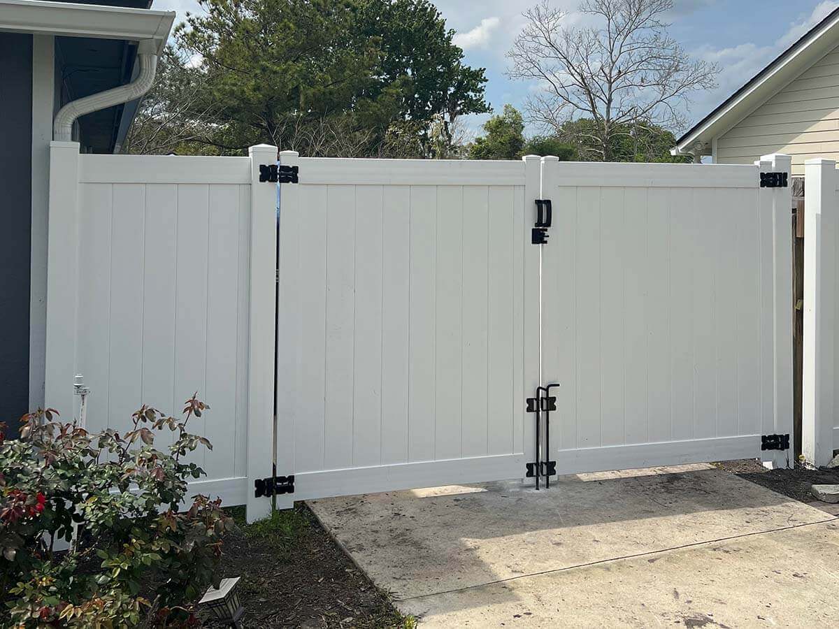 Our vinyl gates come standard with a durable brace, a convenient handle, and a two-way spring latch for enhanced usability. Each gate is constructed to match the specific grade of your property, ensuring a perfect fit and seamless integration with your landscape.
